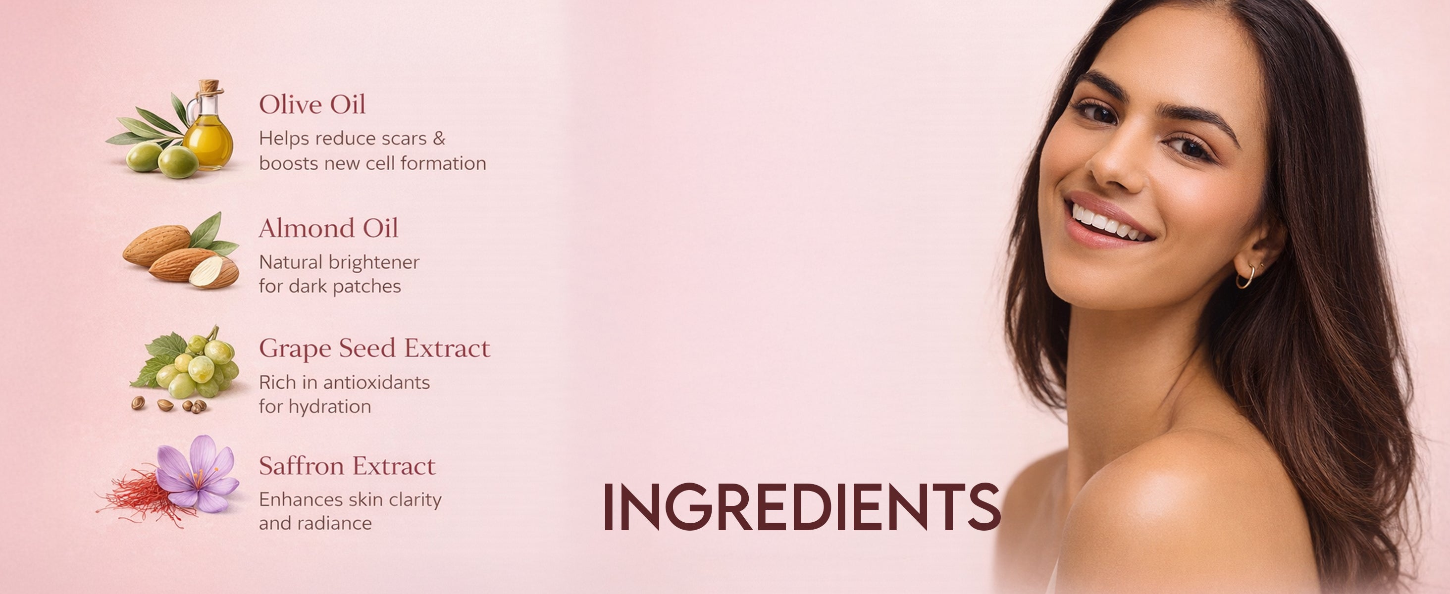 Olive oil 1.0%, Almond oil 0.5%, Coconut oil 2.0%, Saffron extract 0.5%, Grape seed extract 0.5%, Liquorice extract 0.5%, Stearic 4.5%, Bees wax 2.0%, Loban (Styrax benzoin) 0.3%, Parfum 0.5%, Purified water qs.