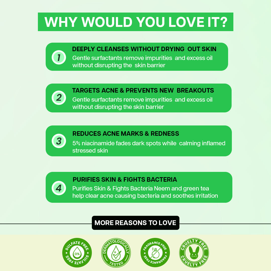 Jovees Derma Green Tea & 2% Salicylic Acid Acne Control Cleanser is meticulously formulated to target acne and enhance skin clarity. Infused with 5% Niacinamide to brighten and even skin tone, and natural Willow Bark and Neem extracts for their antibacterial properties, this gentle cleanser effectively removes impurities without stripping the skin. It helps to unclog pores, reduce blemishes, and prevent future breakouts. With the added benefits of soothing Aloe Vera and antioxidant-rich Green Tea, your skin will feel refreshed, clear, and healthy after every wash.