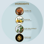 Olive oil, Wheatgerm oil, Jojoba oil, Almond oil, Marigold oil, Turmeric oil, Gold leaf, Bees wax, Emulsifying wax, Capric Caprylic triglyceride, Cetyl, Cetostearyl, Glyceryl stearate, Glycerin, Vitamin E, Sodium hydroxide, Phenoxyethanol, Sodium benzoate, Parfum, Purified water.