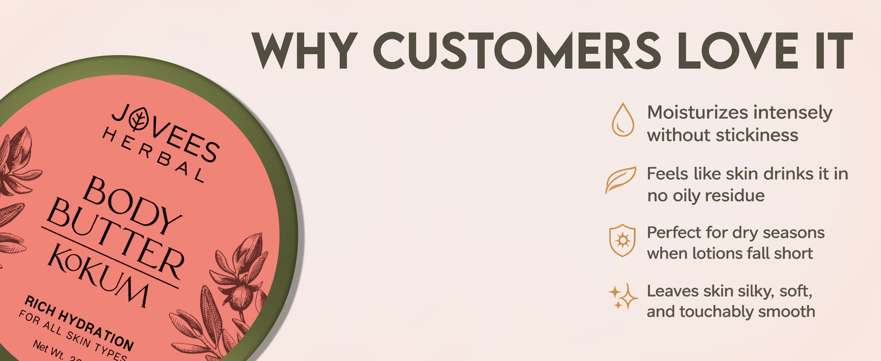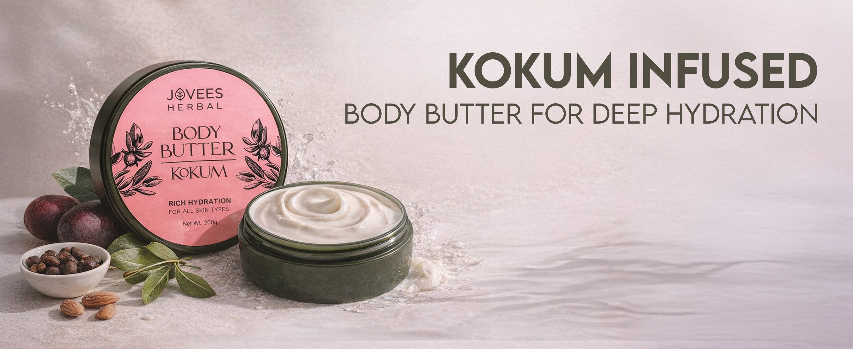 Jovees Kokum Body Butter is formulated with a harmonious blend of nature's finest ingredients to deeply hydrate, moisturize and revitalize your skin. Infused with Kokum butter & Vitamin E the body butter deeply penetrates the skin layers, leaving it supple and revitalized. The soothing benefits of natural oils work harmoniously to deeply nourish & hydrate your skin. Indulge in the silky smooth texture of our natural ingredient body butter as it effortlessly melts into your skin leaving it feeling velvety soft, deeply hydrated, and beautifully radiant.