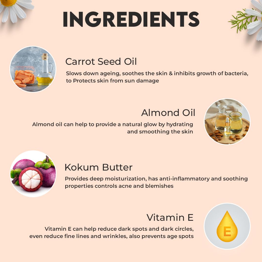 Carrot Oil in product slows down ageing & soothes the skin. Protects skin from sun damage. Regulates sebum production for brighter skin tone, Provides nutrition, Helps treat various skin conditions.