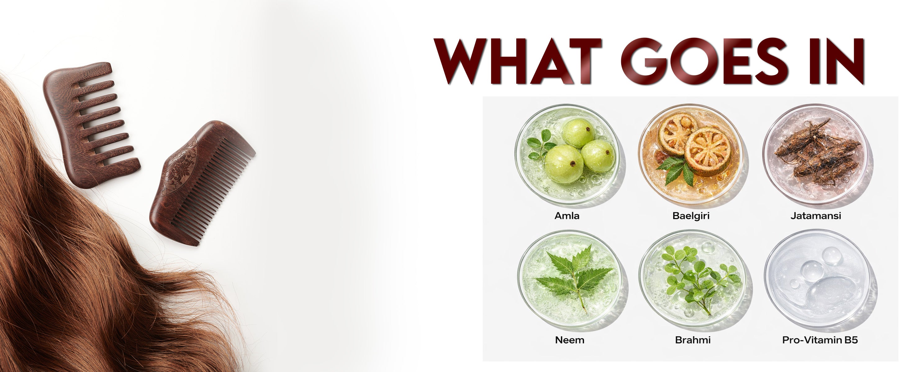 Amla extract, Baelgiri extract,Reetha extract, Jatamansi extract, Neem extract, Thyme extract, Brahmi extract, Pro vitamin B5, Iso propyl alcohol, Glycerin, Phenoxyethanol, Parfum, Purified water.