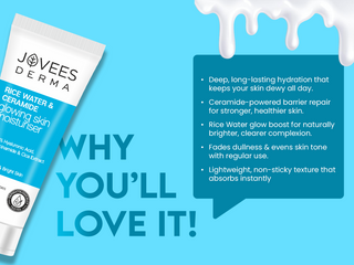 Jovees Derma Rice Water & Ceramide Glowing Skin Moisturiser, a luxurious blend of skincare essentials designed to hydrate, soothe, and revitalizes your skin while remaining gentle on sensitive skin. Enriched with 1% Hyaluronic Acid for deep hydration, 5% Niacinamide to brighten and even skin tone, and calming Cica extract, this lightweight moisturiser provides essential nourishment without clogging pores. The unique blend of Rice Water and Ceramide complex strengthens the skin barrier, leaving your complexion radiant and refreshed. Perfect for daily use, it's your go-to for a flawless, healthy glow.