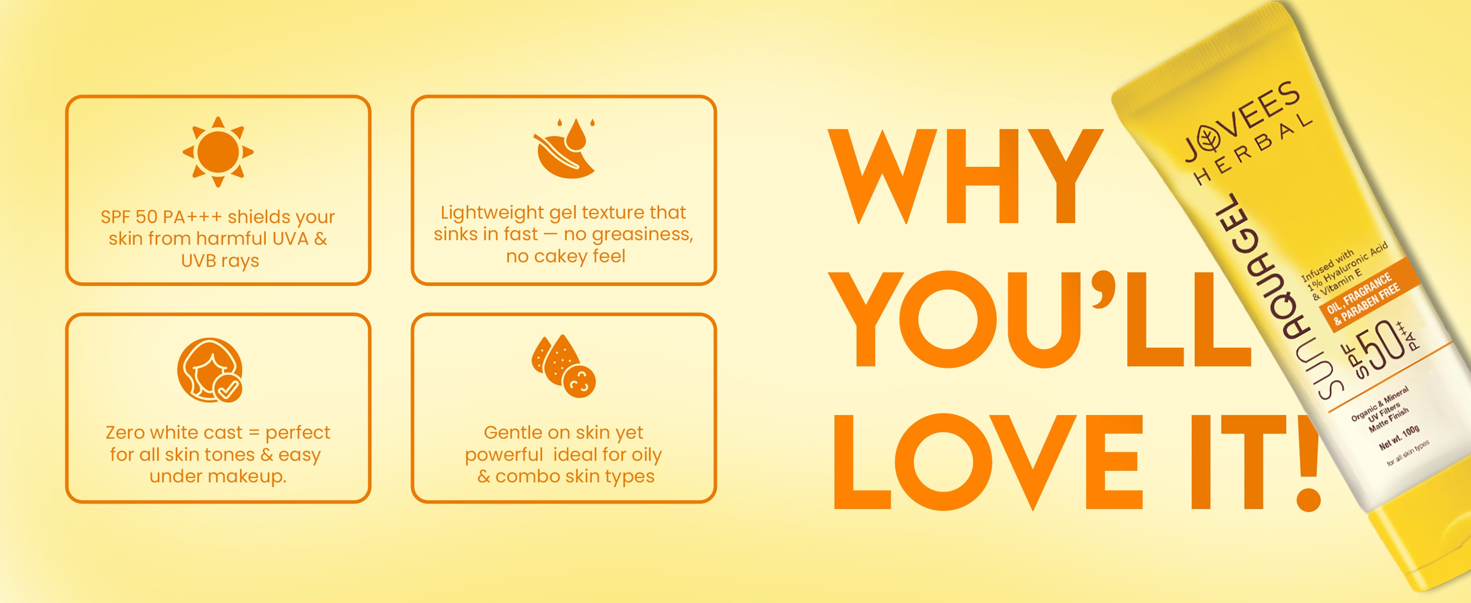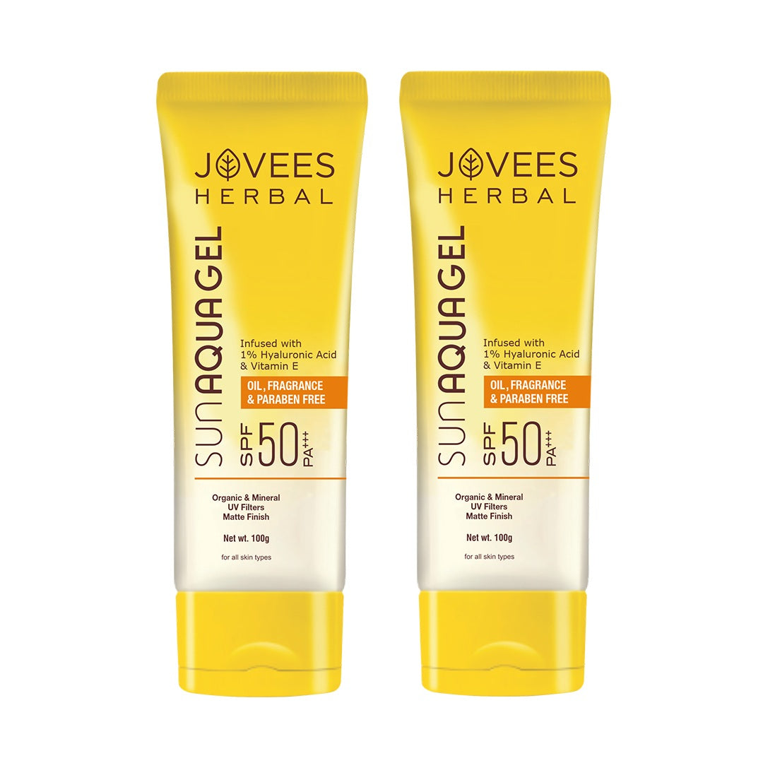 Jovees Sun Aqua Gel SPF 50 PA+++ is a lightweight, oil-free, non-greasy formula that absorbs quickly into the skin. With a blend of organic and mineral UV filters that offer broad-spectrum defence against harmful UVA and UVB rays, it ensures your skin stays shielded and safe. It also contains 1% Hyaluronic Acid, which provides ultra hydration to your skin along with a blend of natural extracts that helps keep your skin healthy, happy and protected all day long.